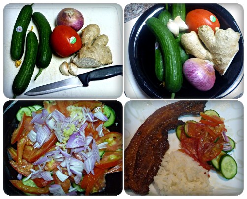 This salad is best paired with something grilled or fried. I baked some pork liempo marinated with dark soy sauce, kikoman soy, tomato ketchup, sugar and ground black pepper.
