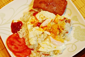 Today’s breakfast I prepared Garlic Fried Rice, Sunny-side-up Egg, and Ham. All fried in my trusty wok.