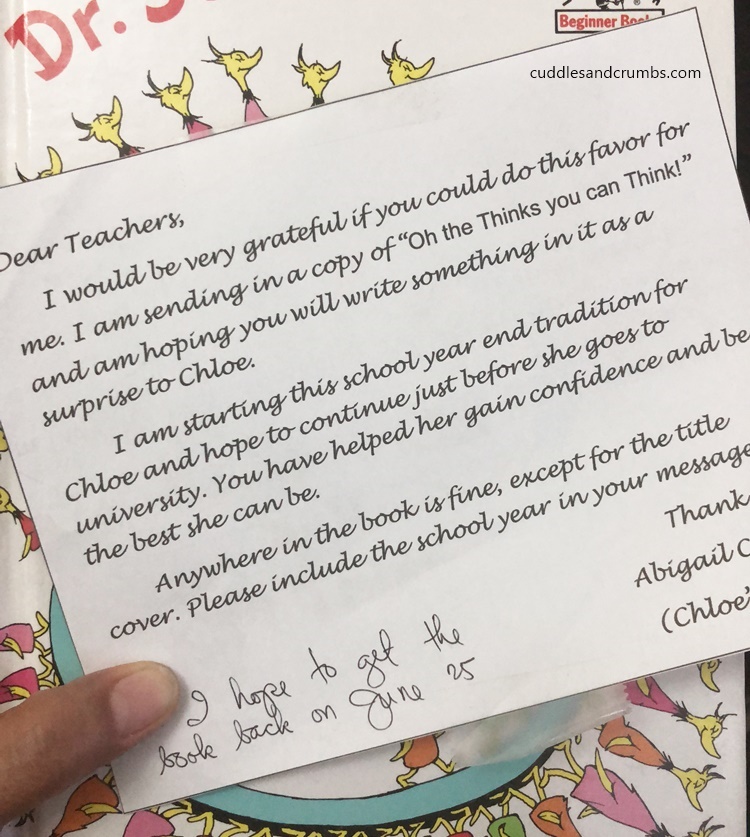 3. Send the book during the last 2 week of school term. I packaged ours in a sealed envelop and ask the office to hand it the teacher.