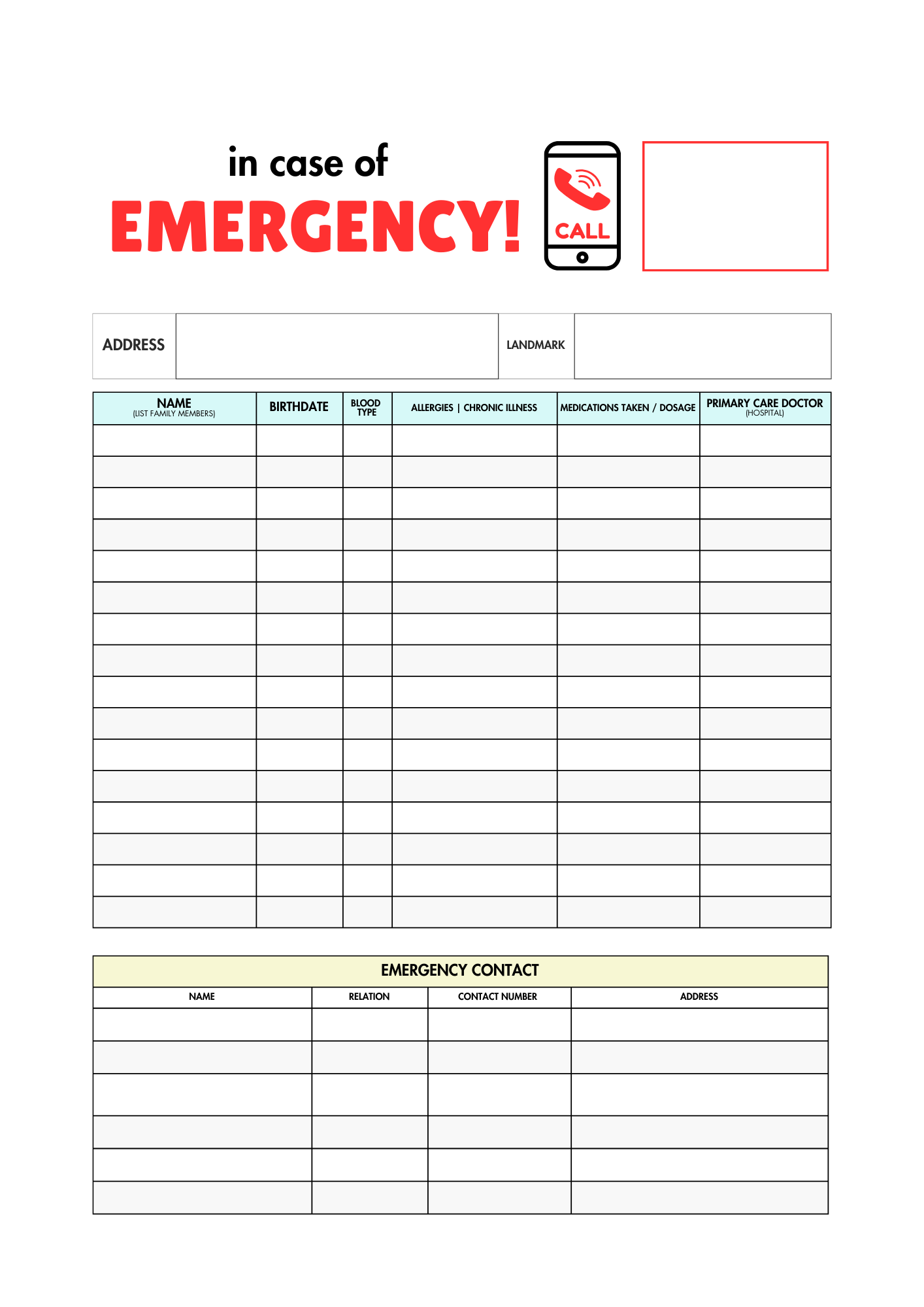 Ensure your family’s safety by having crucial medical information readily available in an emergency. Our free printable emergency poster helps you organize and display important details for each family member in a clear and accessible format. Display poster in a central area preferably where the telephone is and/or in every room of your home.